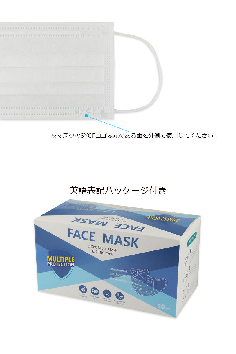 ・ライナー、外層:不織布 ・フィルター層:メルトブローン布 ※マスクのSYCFロゴ表記のある面を外側で使用してください。